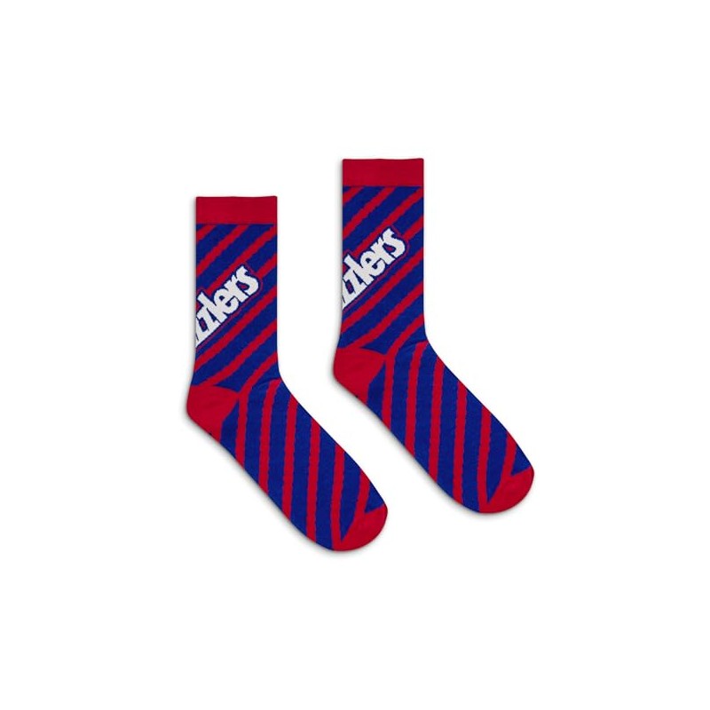 - The Socks With A Twist!: Add some sweet stripes to your soles with this fun pair of candy socks featuring the Twizzlers logo - tastefully embroidered on a pair of comfy blue socks with red diagonal stripes.