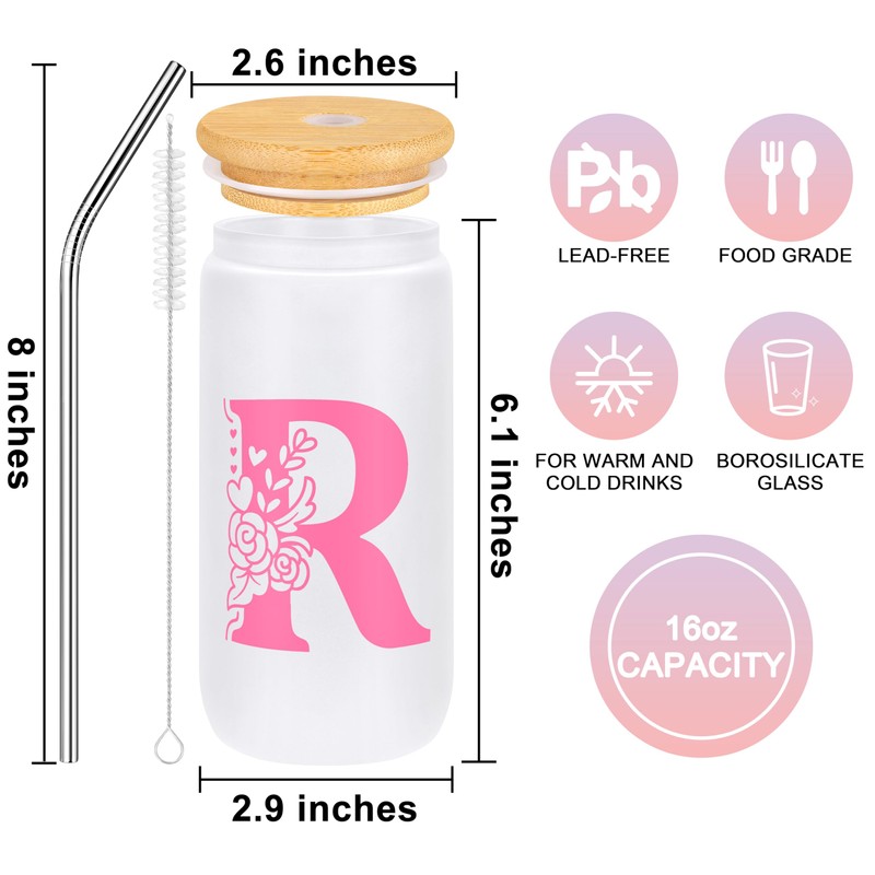 - 【What's in The Gift Box】This thoughtfully gift set includes 1* 16oz Initial glass cup with a bamboo lid and straw, 1* colorful initial necklace,1*greeting card with dried flower,1*pink makeup bag , 1*cute box package, just pick the special letter for her.