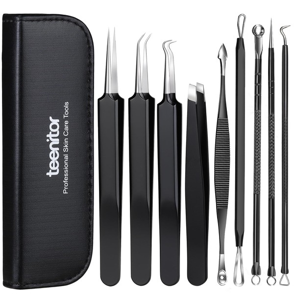 - 9-in-1 Professional Blackhead Remover Tools & Pimple Popper Tool Kit: Teenitor 9 pcs professional facial tools includes 3 different shapes of blackhead tweezers, 5 pimple extractor tools and 1 slant tweezers to meet your needs, can help to remove blackheads, pimples, acne, whiteheads, facial hair and shape eyebrows precisely