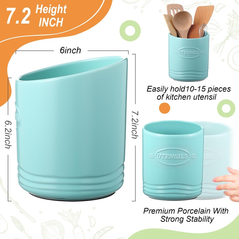 Teenyyou 7.4" Large utensils holder for kitchen counter Ceramic kitchen Utensil Crock Farmhouse Vase Cooking Caddy Organizer with Slanted Top for House Decor Housewarming Birthday Gif(Turquoise)