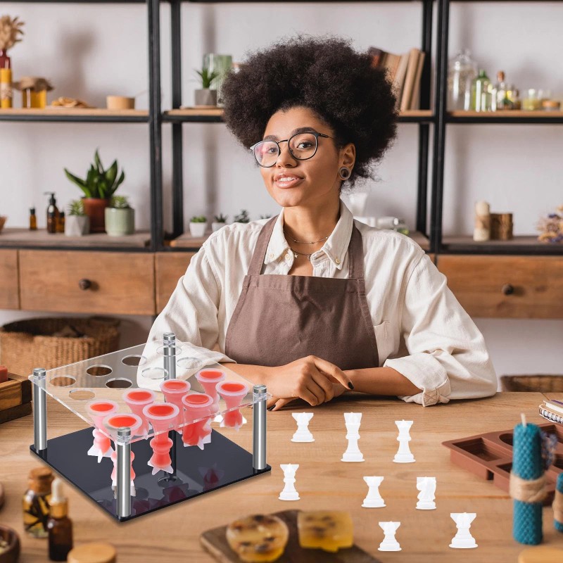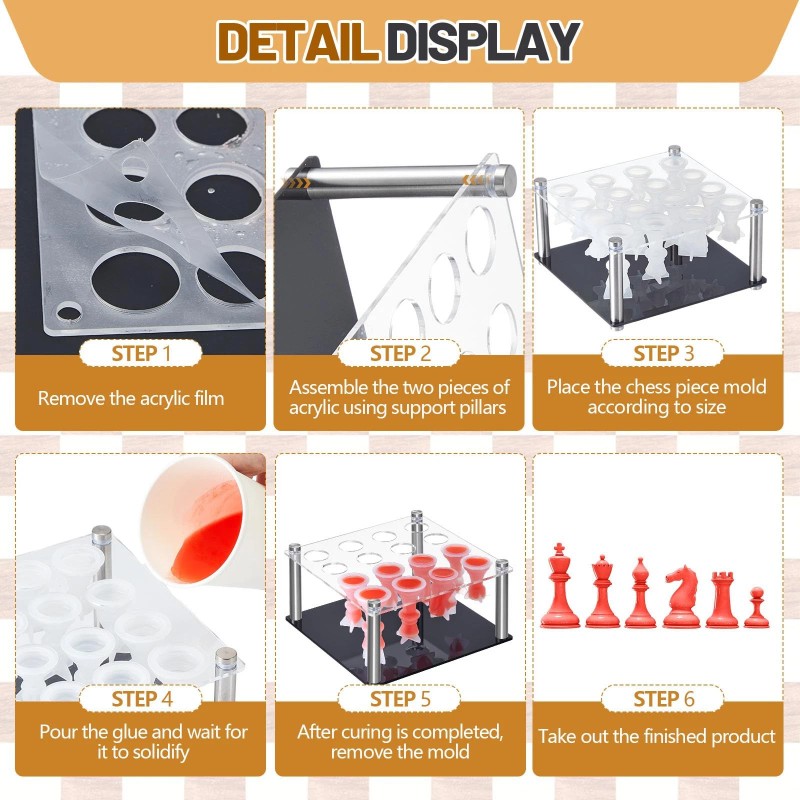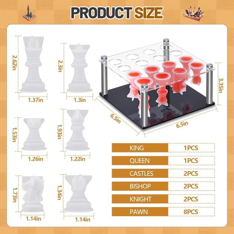 Creative DIY: use our molds to add unique colors or elements, creating personalized chess pieces; The stand ensures stable placement of molds; The mold sizes replicate the dimensions of real life chess pieces