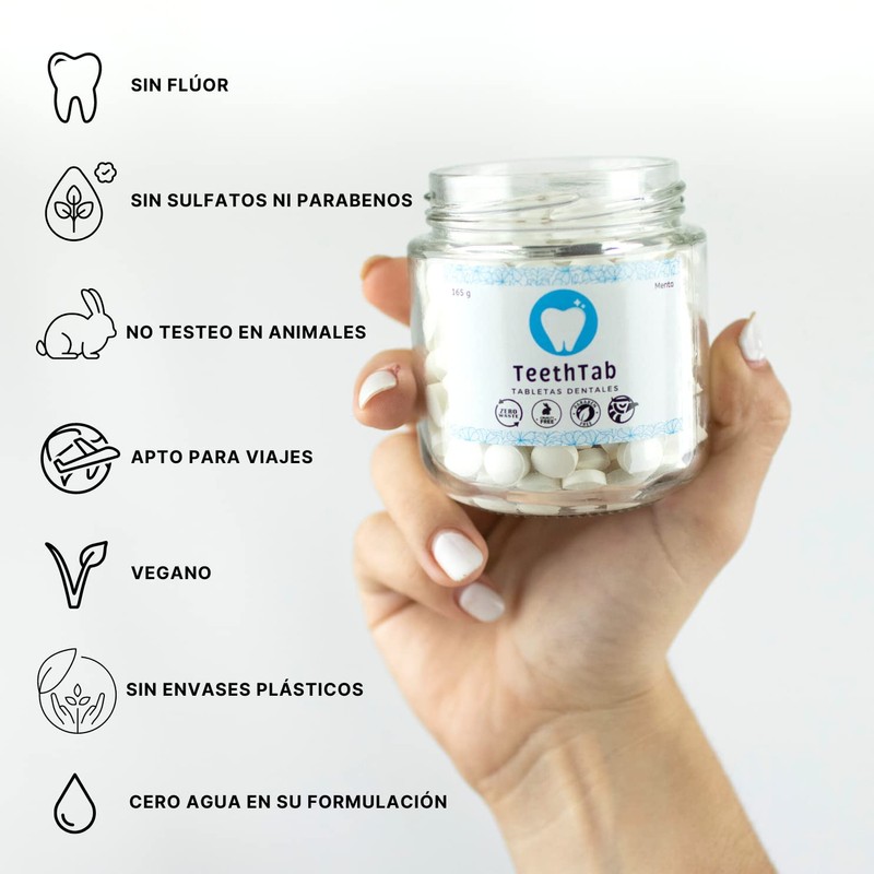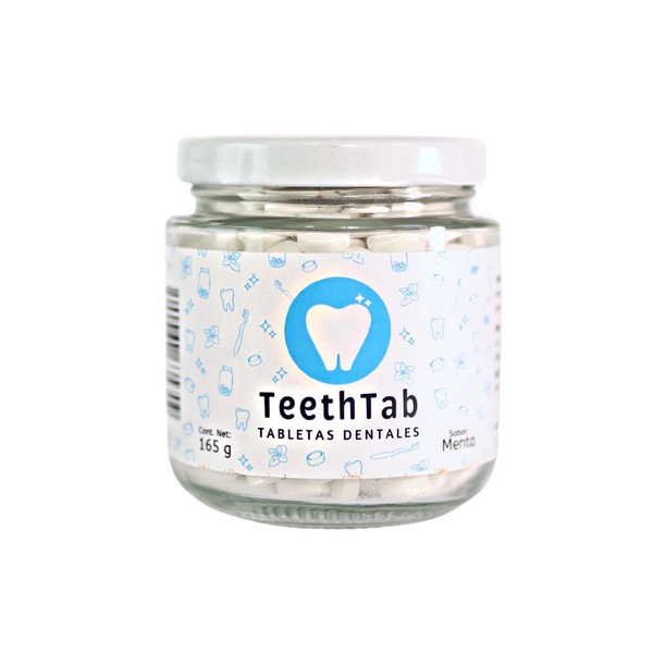 TeethTab es un dentífrico en forma de tabletas masticables. Las tabletas se entregan en un frasco de vidrio. Advertencias: - Las tabletas son altamente higroscópicas (absorben humedad) por lo que se recomienda cerrar el frasco después de cada uso para mantener la composición y sabor de las tabletas. - Se recomienda no ingerir las tabletas. - No dejar al alcance de los niños. - Contiene ingredientes derivados del coco y aceites esenciales.