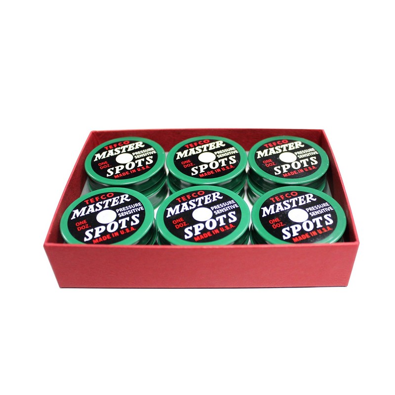 Tefco Master Spots are the standard for your table. Tin of 12 pre-gummed, pressure-sensitive black spots with white dot. Made in the USA!