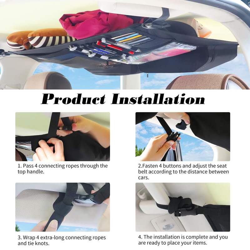 - Quick and Tool-Free Installation:This car ceiling cargo net don’t need to use any tools for installation,only four steps are needed to complete the installation
