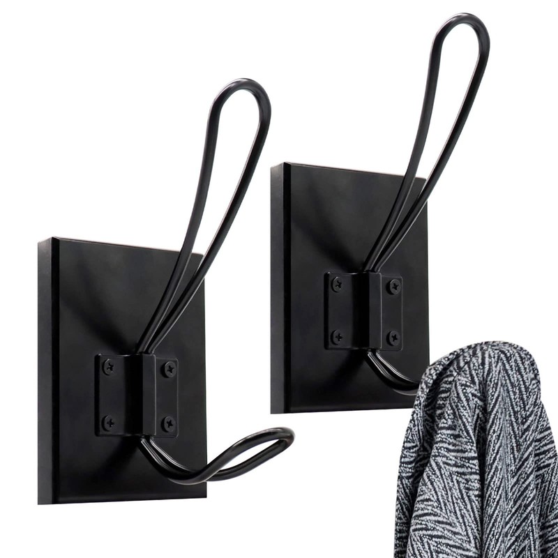 TEGUEPS Coat Hooks Wall Mounted, 2 Pack Wood Wall Hooks for Hanging, Towel Hook for Bathroom, Bedroom, Entryway, Kitchen (Black)