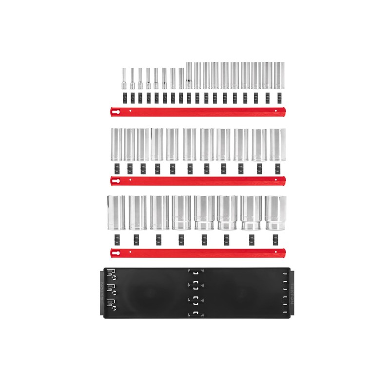 - Includes 8-pc. 1/4 in. drive deep 6-point sockets: 4, 4.5, 5, 5.5, 6, 7, 8, 9 mm; 10-pc. 3/8 in. drive deep 6-point sockets: 10, 11, 12, 13, 14, 15, 16, 17, 18, 19 mm; 19-pc. 1/2 in. drive deep 6-point sockets: 20, 21, 22, 23, 24, 25, 26, 27, 28, 29, 30, 31, 32, 33, 34, 35, 36, 37, 38 mm; 3-pc. socket rails; 3-pc. rail trays