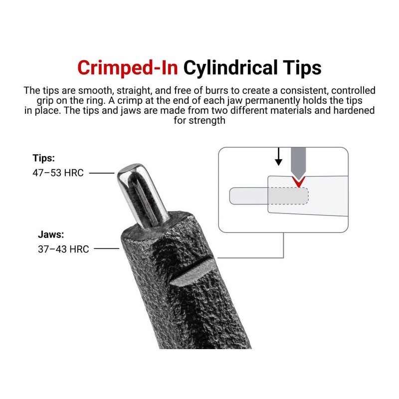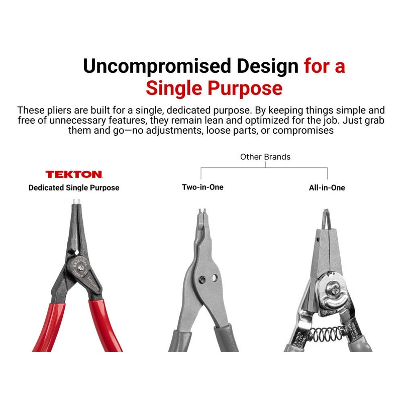 Tekton Retaining Ring Pliers are built for a single, dedicated purpose. By keeping things simple and free of unnecessary features, they remain lean and optimized for the job. Just grab them and go—no adjustments, loose parts, or compromises. The tips of the pliers are angled to securely hold the ring with a downward pressure, preventing the ring from slipping off. The tips are smooth, straight, and free of burrs to create a consistent, controlled grip on the ring. A crimp at the end of each jaw permanently holds the tips in place. The two forged handles are permanently bolted together and spring-loaded. The spring is oiled and housed inside the joint, keeping it hidden and protected while providing smooth, quiet operation. The joint is not adjustable or serviceable. The forged handles get wider in the center and are coated with vinyl grips to improve control and comfort. The tip size and function are clearly laser-marked on the pliers for quick reference. The tips are made of ASTM-E52100 bearing steel that's hardened to 47–53 HRC with nickel plating. The jaws are made of S45C steel that's hardened to 37–43 HRC with a black oxide finish and a light coating of rust inhibitor. The pivot screw is made of AISI-1015 steel with nickel plating. It is not removable. The handle grips are made of single-layer vinyl, and the oiled internal spring is made of 1065 spring steel. Refined Tips for Strength and Control – The tips are angled, hardened, and crimped-in to provide optimized strength and control Uncompromised Design for a Single Purpose – By keeping things simple and free of unnecessary features, they remain lean and optimized for the job—no adjustments, loose parts, or compromises Secure Hold for Reduced Twisting – The combination of the outward angled tips and the flat surface at the base of the tips creates a very secure hold on the ring, which reduces twisting and the risk of slipping off