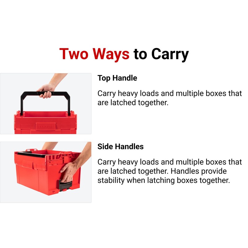 - Two Ways to Carry – Use the top or side handles to carry the tote on its own or carry multiple boxes that are latched together