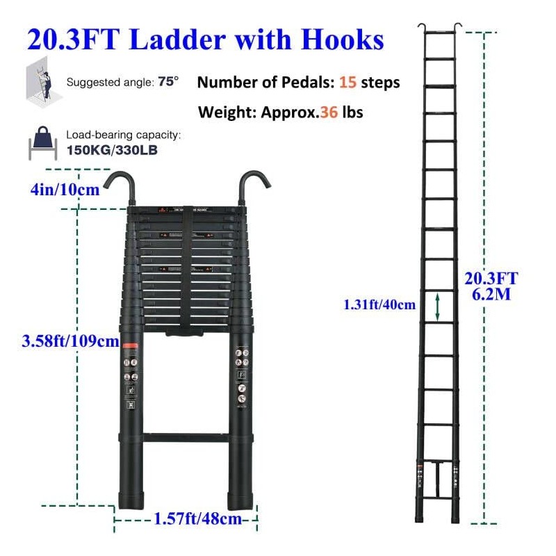 - High-quality aluminium folding ladder---This safe and sturdy folding ladder CE approved complies with European standards. The 6.20 meter telescopic ladder is made of high quality aluminum alloy. The maximum load capacity is 150 kg.
