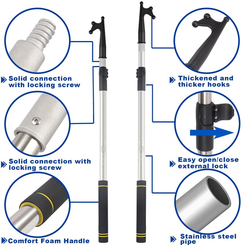 - 3.Multi-purpose Boat Hook Pole telescoping: Pull: Use boat hook pole to pull to the seawall where your boat arrives. Push: Push the seawall edge with the boat hook pole floating and leave for departure. 3.Drag: Use heavy duty telescoping boat hook pole at a perfect angle of 45 degrees to pick up the rope.Hanging: Use boat hook pole telescoping floating length to hang things high up, such as bird feeders, colored lights, and Christmas decorations.