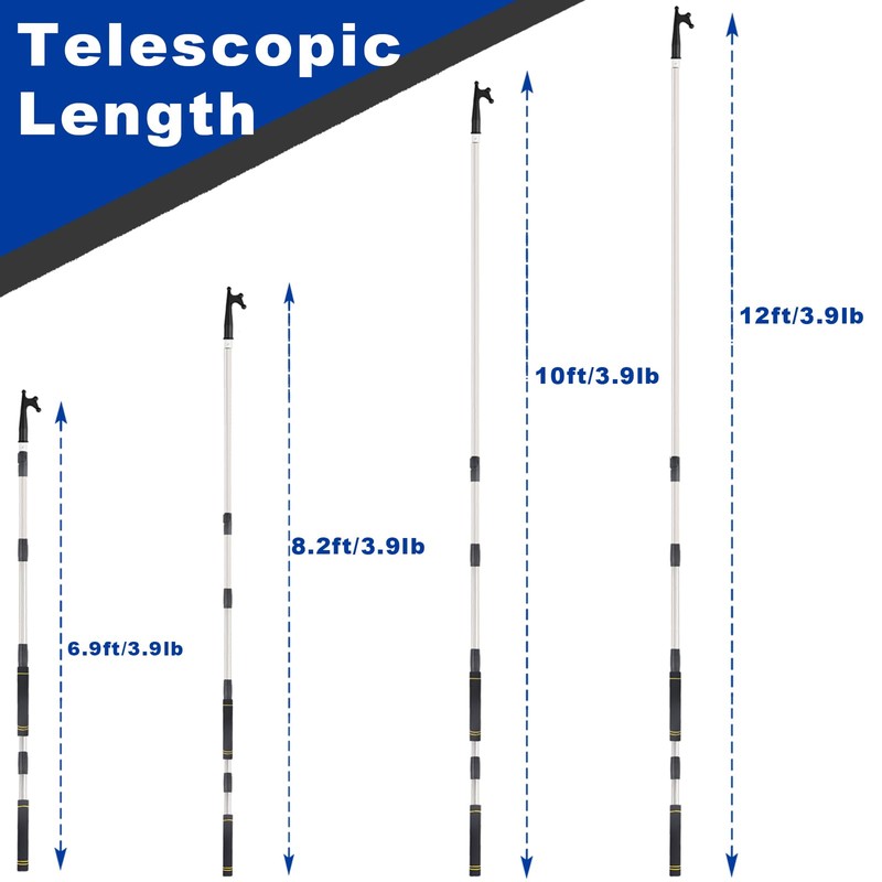 - 2.Telescopic Design: Telescopic boat hook has three sizes, shortest 2.46ft extends 4.8ft after fully opening the outer lock, middle length 5.8ft extends 8.8ft after fully opening the outer lock, longest 6.9ft extends 12ft after fully opening the outer lock.