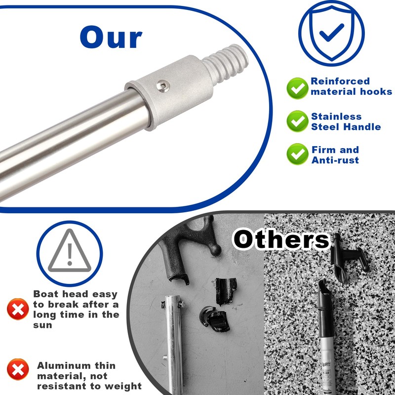 - 1.High-quality Material: boat hook made of thickened stainless steel, strong and durable not easy to bend, corrosion-resistant and anticorrosive, can be used in harsh conditions, seawater and freshwater universal, this boat hooks is an essential tool for mooring and sailing.