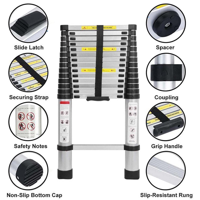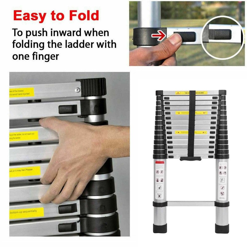 - 【Telescopic Extension Design】Compacting from handy 3ft to 14.5ft. With inward slide latches, you can adjust the height of the ladder rung by rung in 11.8inch increments to fit specific requirement such as repairing ceiling lights, hanging picture frames or painting walls.