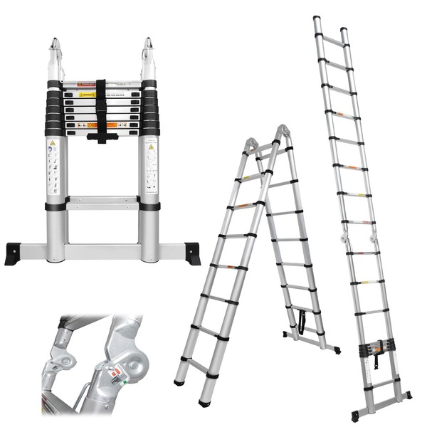 - 🔥 【2-In-1 A Frame Telescoping Ladder】 This multi-purpose expansion ladder is not only an A-frame ladder but also a straight extension ladder. The telescoping ladder is made of lightweight, high-strength aluminum, which reduces the weight of the ladder while maintaining its strength. Folding ladders offer excellent load-bearing properties and slip resistance up to 330 lbs.