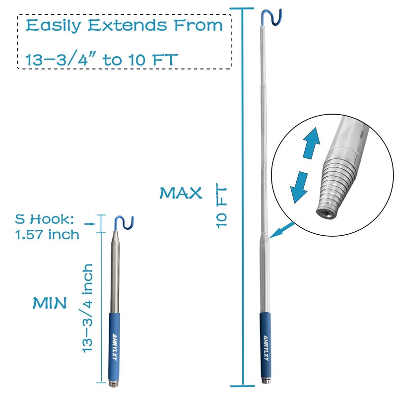- PORTABLE & DURABLE: Extend from 13-3/4" to 10 Feet. Easy to store & Carry. Made of durable stainless steel. Lightwight, sturdy, not rust and long life usage. Anti-slip rubber handle, easy to grip and comfortable to hold. The S hook & double hook are rubber coated for a gentler and firmer grip