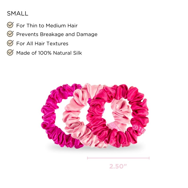 - PICK YOUR SIZE - Our Silk Scrunchies come in two different sizes to perfectly match your hair type. The large scrunchies are great for thick hair and the small scrunchies are ideal for thin to medium thick hair.