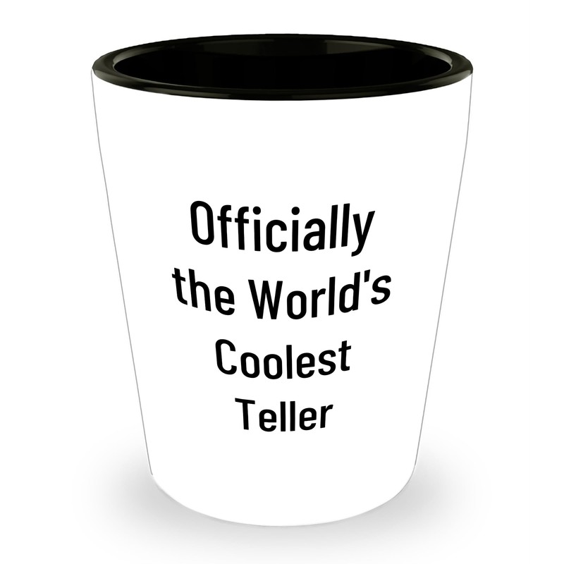 - Give the gift of humor with our Officially The World's Coolest Teller shot glass, perfect for birthdays, anniversaries, or any special occasion. The 1.5oz capacity is perfect for a morning coffee or tea, and the white color is a classic and timeless choice. This shot glass is a thoughtful gift for anyone who loves a good quote.