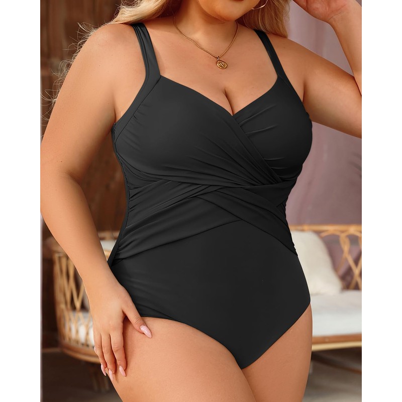 - Plus Size Black Tummy Control Swimsuits for Women: This elegantly designed swimsuit features a ruched criss cross pattern on the torso, which expertly conceals any imperfections and creates a slimmer silhouette.