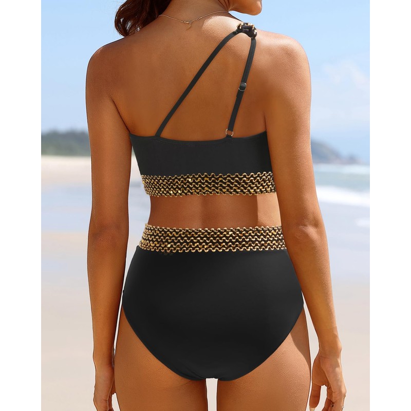 - One Shoulder Bikini Set: This black chic one-shoulder bikini top features a soft, removable push-up padded bra and an adjustable shoulder strap for a perfect fit.