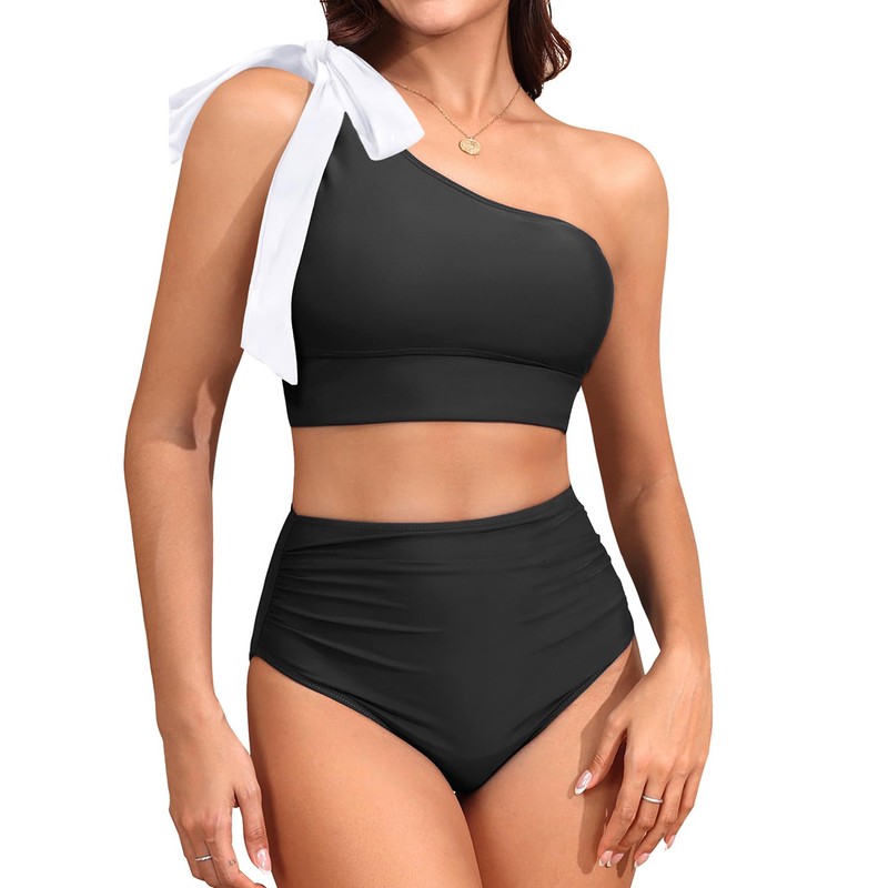 • Features - The two-piece swimsuits for women are designed with removable padding, a one-shoulder long-lined bikini top, a high waist tummy control full coverage bottom, and a tie.