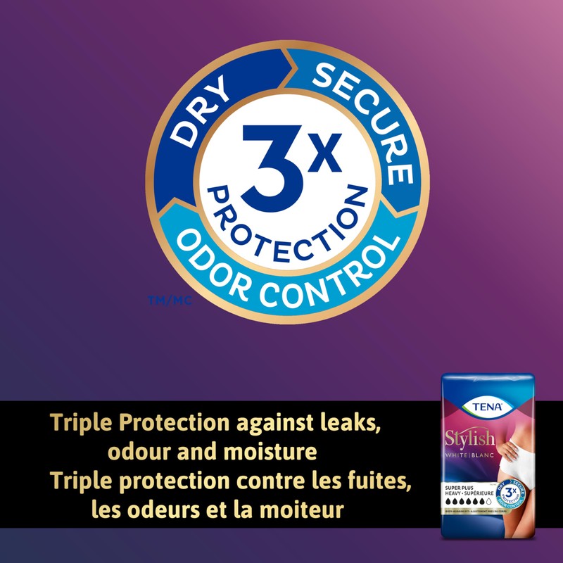 Women's Super Plus incontinence underwear is specially designed for the needs of women for a comfortable fit. Super Plus are made with material that looks and feels like real underwear with absorbency for moderate to heavy bladder leakage protection. The efficient, highly absorbent target zone with super absorbent polymers ensures protection where it's needed most, while Advanced Odor Protection technology helps control odors. The comfortable waist band is soft and stretchable with cottony-soft material offering maximum comfort and discretion.