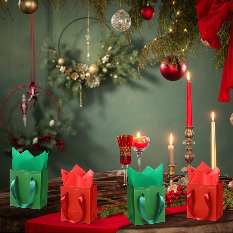 Tenare 12 Pcs Small Gift Bags Mini Metallic Paper Bag with Handle Tissue Christmas Thanksgiving Birthday Party Favor(4 x 2.75 x 4.5 Inch,Red and Green)