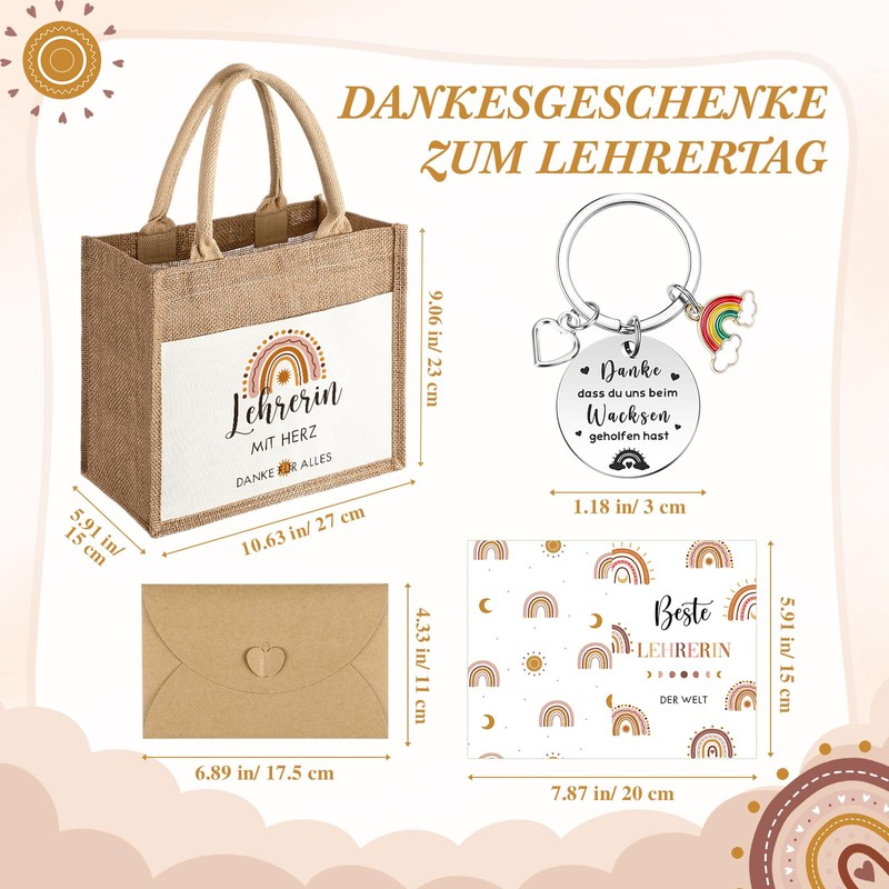 - PACKAGE CONTENT You will get 3 jute carrier bags, 3 keychains, 3 greeting cards, 3 envelopes as leaving teacher gifts. Each of these items has a deep meaning, expresses students' respect for their teachers, and conveys good wishes for their development and support. These gifts are in Bohemian rainbow style and symbolise hope and colour, making this gift more vibrant and heartfelt
