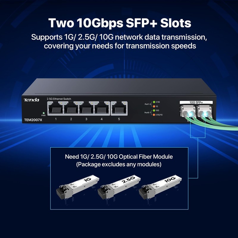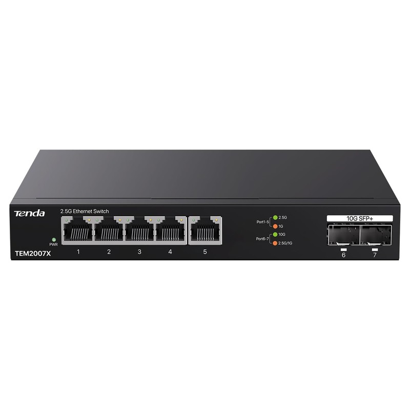 - 【𝗦𝗨𝗣𝗘𝗥-𝗙𝗔𝗦𝗧 𝗕𝗔𝗡𝗗𝗪𝗜𝗗𝗧𝗛】Tenda TEM2007X equipped with 5*100/ 1000/ 2500 Mbps RJ45 ports and 2*100/ 1000/ 2500/ 10000 Mbps SFP slots, all ports support wire-speed forwarding, capable for high-speed network requirements
