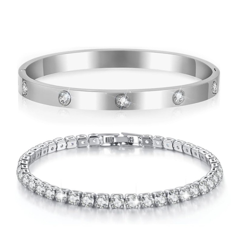 Tennis Bracelet Women's Zirconia Bangle 2 Pieces Bracelet for Women Stainless Steel 2.5 mm Wide 17 cm Bracelets Jewellery Gift Silver Gold for Mum Friend Daughter Bracelet Women Bracelet