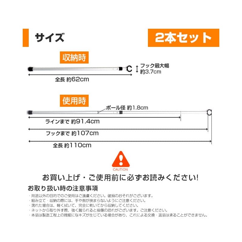 - Size: When stored: Length: Approx. 24.4 inches (62 cm); During use: Length: Approx. 43.3 inches (110 cm) (to the bottom of the hook): 42.1 inches (107 cm); Pole diameter: Approx. 0.7 inches (1.8 cm); Hook width: Approx. 1.5 inches (3.7 cm)