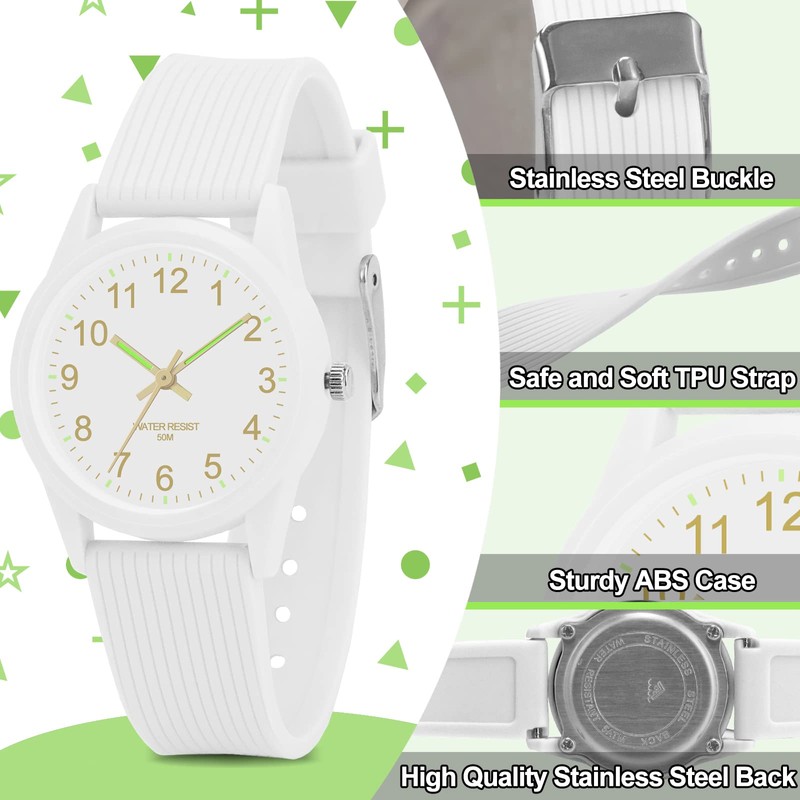 - ⌚【Time teaching kids watch】🔢This analog watch adopts a high-definition acrylic mirror, which can clearly see the numbers and green hands of the dial, improving the efficiency of learning time.