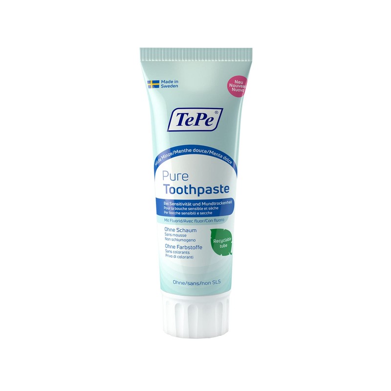 - Swedish formula: TePe Pure toothpaste mild mint is produced in Sweden from a few carefully selected ingredients. Made in collaboration with dental experts. Specially designed for people with sensitive gums and dry mouth.