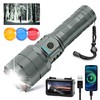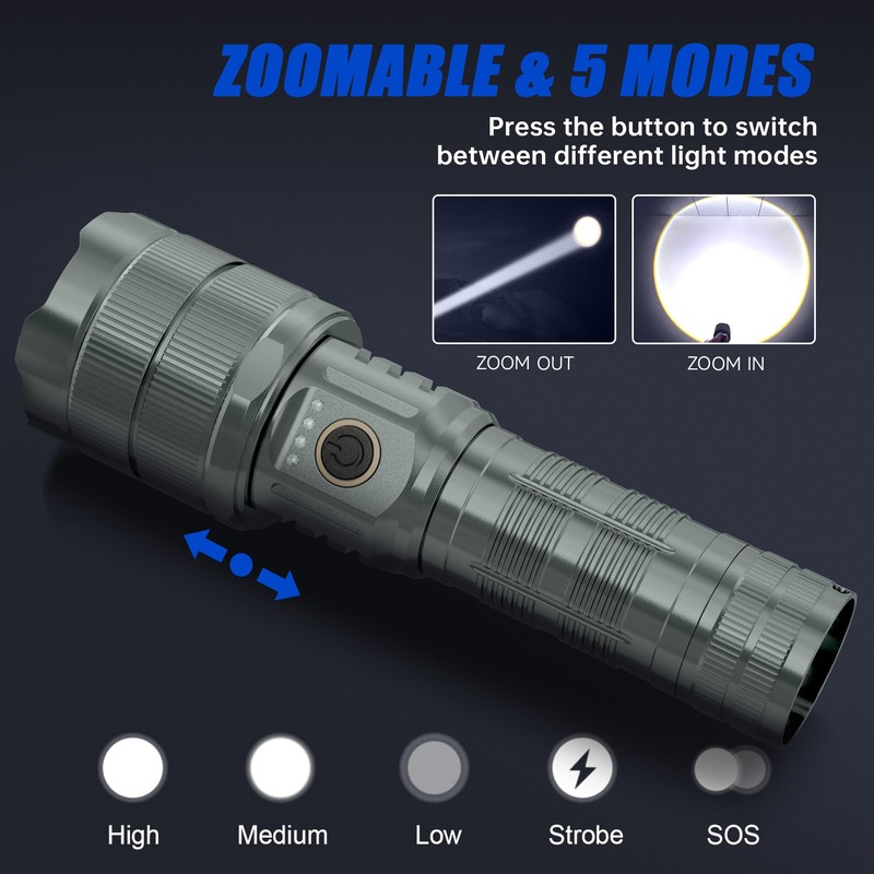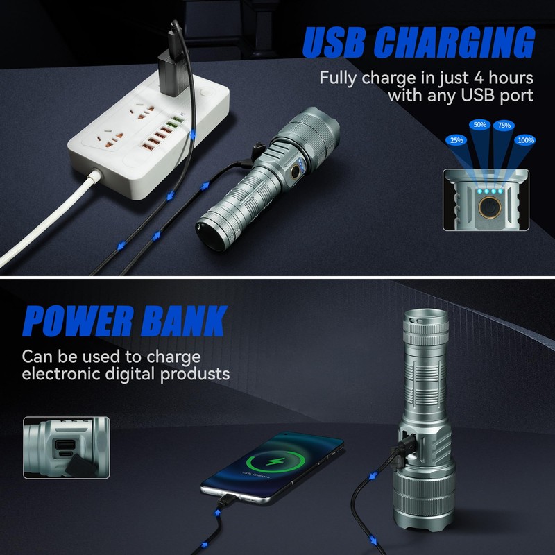 - ⚡ USB INPUT & OUTPUT: This rechargeable flashlight has a built-in Type-C port, making it easy to charge it quickly with the included USB cable. It also has a built-in USB power input port that can be used as a mobile power source for your phone and other devices. The four blue lights above the switch each represent about 25% of the battery level, making it easy to keep track of usage.