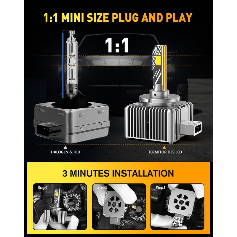 • 【900% Brighter - See The Road Like Never Before】Termitor D3S LED bulbs use 24 high-performance chips to give you light that's 9 times brighter than standard D3S xenon HID bulbs. Replace your weak yellow light bulbs with these bright white (6500K) bulbs and finally see clearly at night.