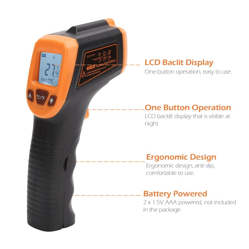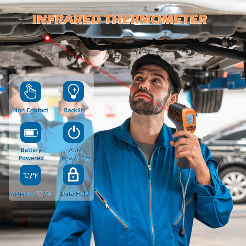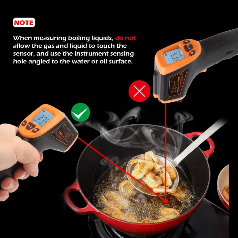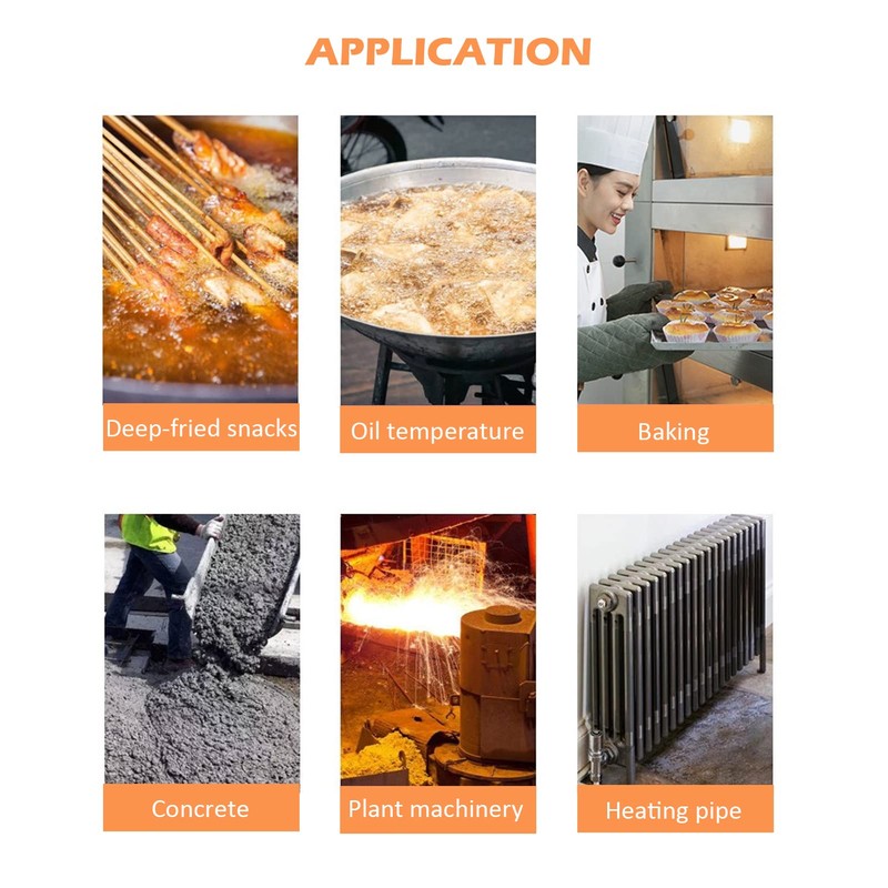 - APLICACIÓN: Este termómetro de infrarrojos se utiliza para medir la temperatura de la superficie de los objetos, tales como tuberías de agua caliente, partes calientes del motor, superficies de cocción, la temperatura del aceite, hormigón, hornear, maquinaria, etc.