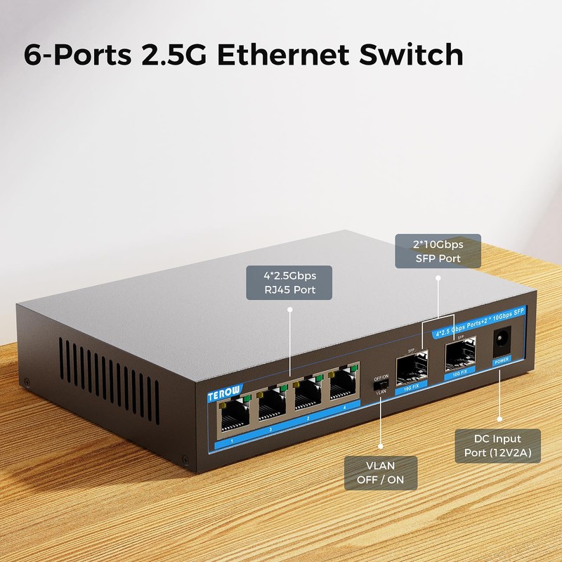 TEROW 6-Port 2.5G Ethernet Switch Unmanaged , 4 x 2.5G Base-T & 2 x 10G SFP, Multi-Speed Network Switch, Compatible with Gigabit & 10Gb, Desktop/Wall Mount, Ideal for AP, NAS, PC