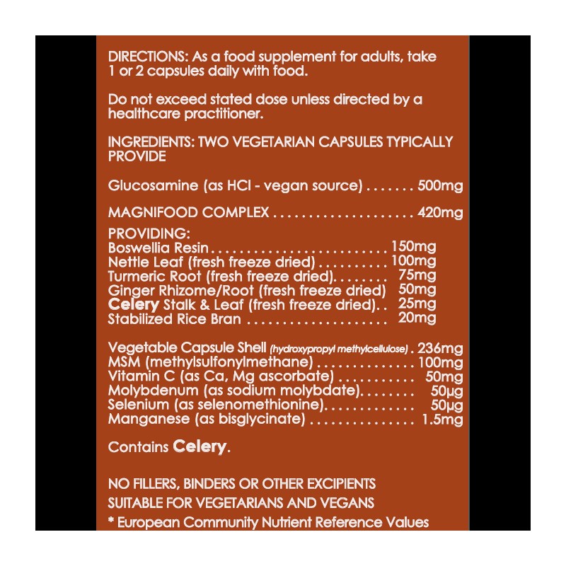 Magnifood complex (Boswellia Resin, Nettle Leaf, Turmeric Root, Ginger Rhizome/Root, Celery Stalk & Leaf, Stabilised Rice Bran) |