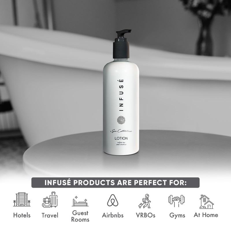 - MINIMAL WASTE, MAXIMUM EFFICIENCY: Infuse White Tea and Coconut Lotion is designed with vacation rental owners and Airbnb hosts in mind. Unlike classic travel size bottles of bathroom lotion that contribute to waste, our compact lotion allow you to minimize your ecological footprint.