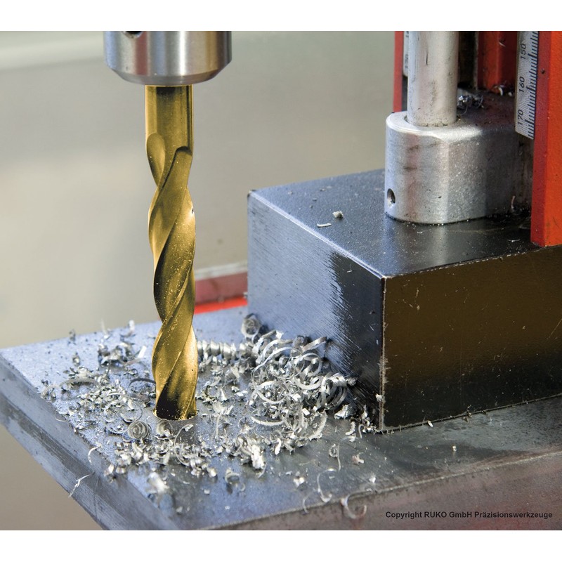 - Ground twist drill bit made of high-performance high-speed steel plus titanium nitride wear protection coating.