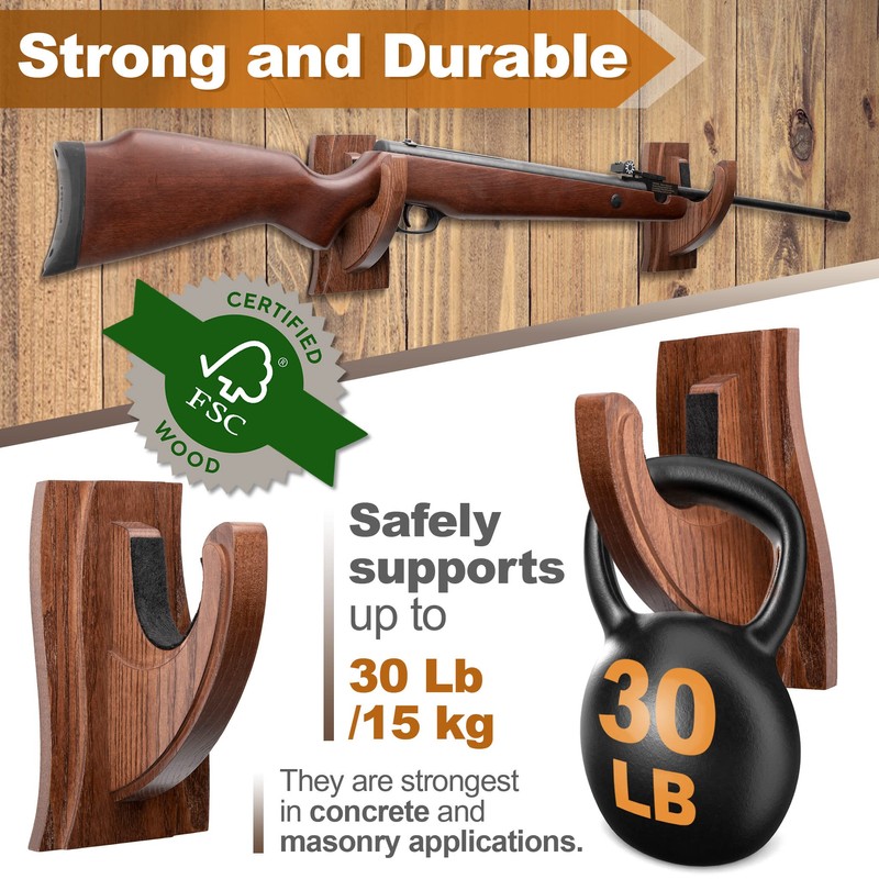 • REAL HARDWOOD. This Gun Rack is made of high-quality solid wood covered with a classic Brown finish that complements any room. Hooks are covered with felt-for fixation to give your gun the protection it deserves.