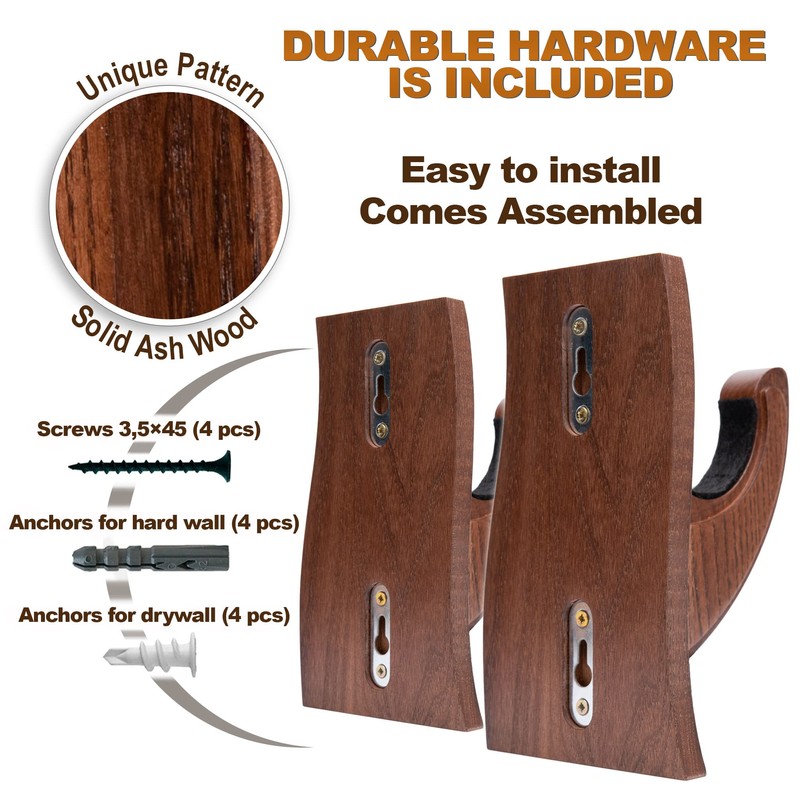Contents: 2 wooden hooks, 4 screws, 4 dowels for drywall, 4 dowels for hard wall.