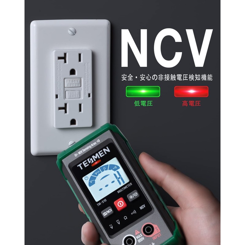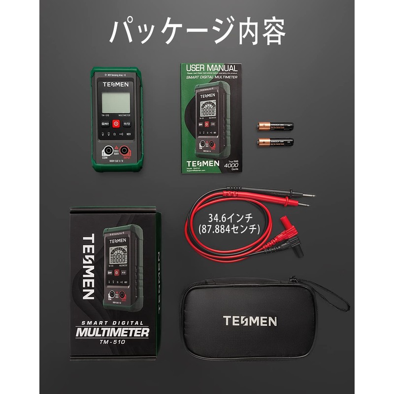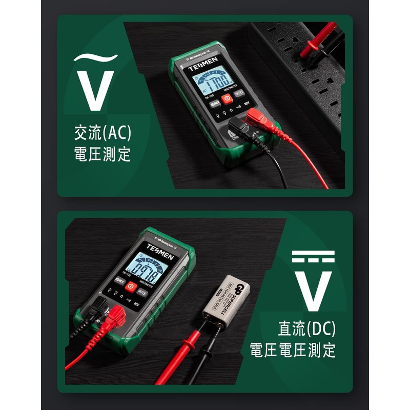 TESMEN TM-510 400 Count Smart Digital Multimeter TESMEN TM-510 is a multi-functional smart digital multimeter with 4000 count, accurate measurement of AC (AC) / DC (DC) voltage, resistance, and conduction, widely used in home work and auto power testing. Smart Measurement & Auto Range DC Voltage AC Voltage Resistance (Ω) Conductivity The meter will automatically measure without the user choosing the mode or range. Non-contact Voltage Detection (NCV) It can safely measure the voltage by keeping the probe close to the power source without using a test lead. Auto Shutdown If there is no operation for more than 15 minutes after turning on the power, it will automatically turn off to save power. Data Hold Press the Data Hold button to activate the function. When that happens, the screen will show "H" mark. Low battery display When the battery voltage is lower than the working voltage, the low battery icon will be displayed on the upper right side. Conductivity testing Conduction testing is a resistance test that quickly identifies whether the circuit is open or closed. Backlight and Flashlight Backlight and flash light help make work more comfortable in dark environments. What You Get TM-510 Smart Digital Multimeter: 1 Test lead: 2 AAA batteries: 2 Storage bag: 1 User Manual: 1