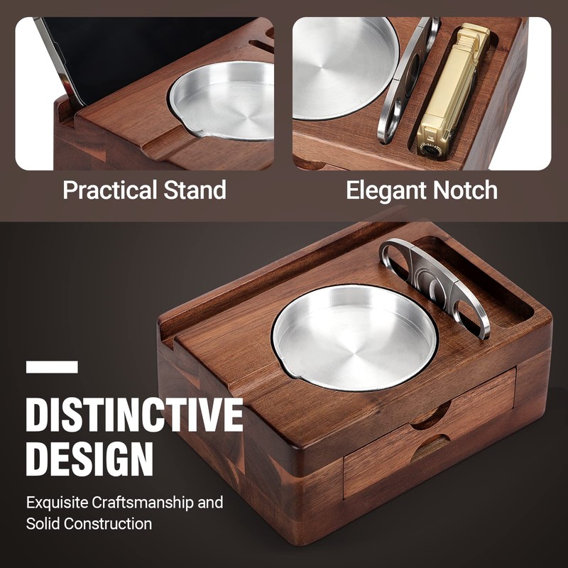 - Ingenious Practical DesignThis cigar ash tray has multiple designs such as a cigar slot, cigar cutter holder, lighter slot, phone tablet stand and an accessory drawer on the side to store cigar punches, cigar cutters and other cigar accessories. The removable aluminium ashtray not only protects the wooden tray to hold your cigars, but can also be easily removed and rinsed clean with just water