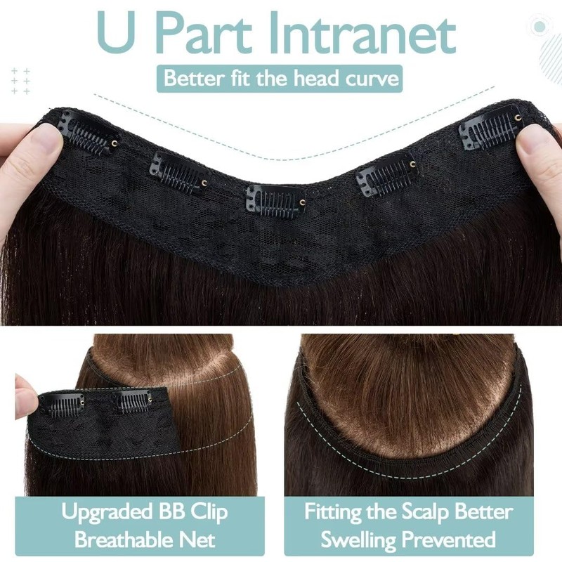 - {Special one-piece U-shaped design}Our hair extensions are a one-piece U-shaped design with 5 clips, which is more ergonomic and ensures a tight fit and a stronger fit. It only takes 1 minute to put on quickly and conveniently. Does not damage hair, leaves no glue, and provides a lightweight and comfortable wearing experience.