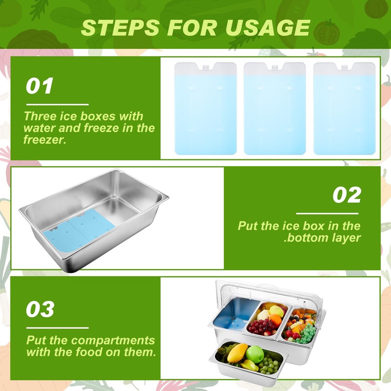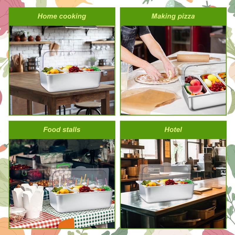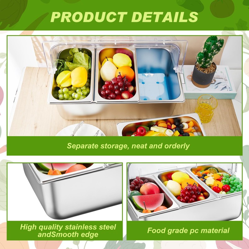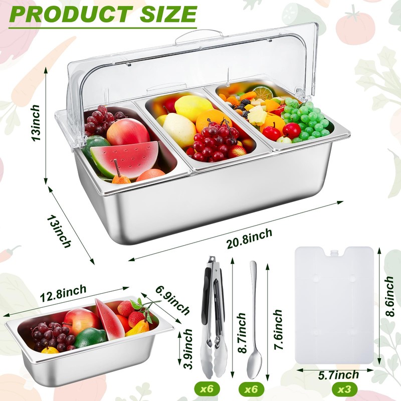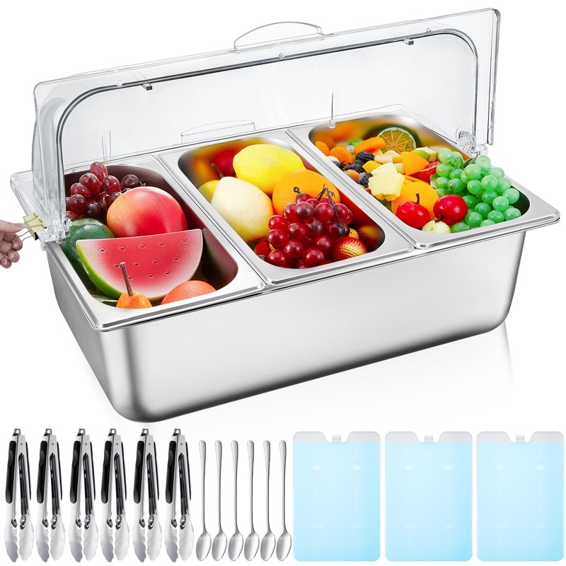Tessco for you 1 Set Countertop Chiled Ice Food Serving Display Container Condiment Dispenser with Lid Stainless Steel Serving Tray with Clamps Spoons Ice Box for Restaurant Kitchen (3 Compartments)