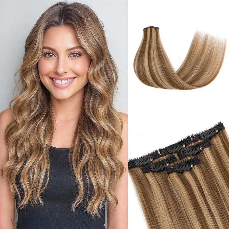 tesshair Clip in Hair Extensions Real Human Hair Remy Single Clip Double Weft 6 Pcs Seamless Highlight Straight Human Hair Clip in Extensions for Women #4P27 Medium Brown & Dark Blonde - 12 Inch