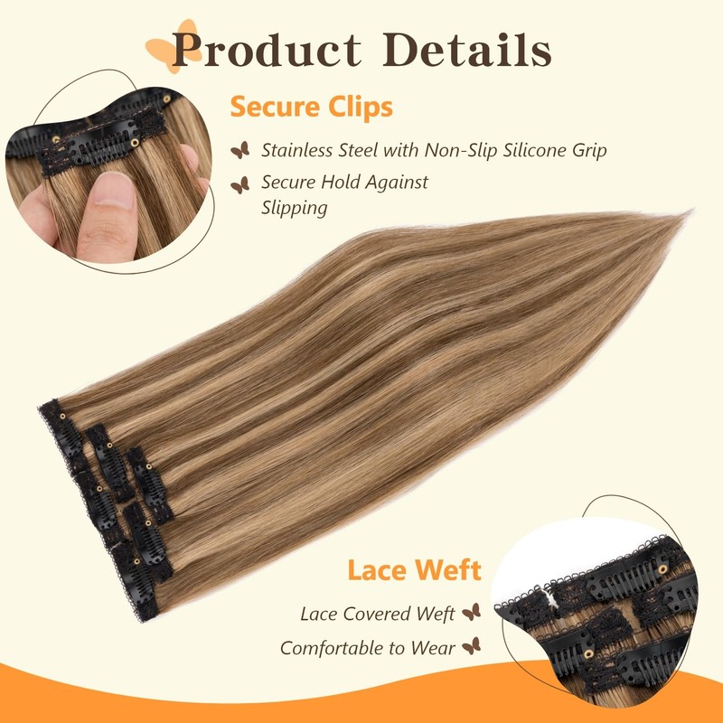 - 【tesshair Real Human Hair Extensions Clip in】Our clip in hair extension are crafted from 100% human hair, featuring an upgraded design for a stronger hold and a firmer fit. The lace-design clips ensure a natural and invisible look, seamlessly blending with your own hair while providing maximum comfort. They fit closely to the natural curvature of the head, offering a flawless finish. With proper care, our seamless clip-in hair extensions can last up to 3–4 months.