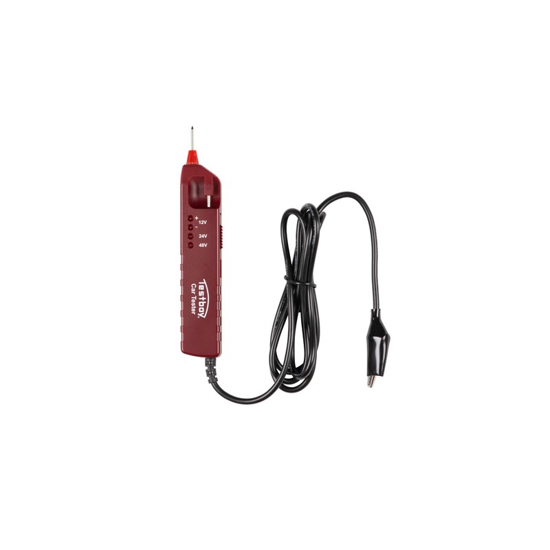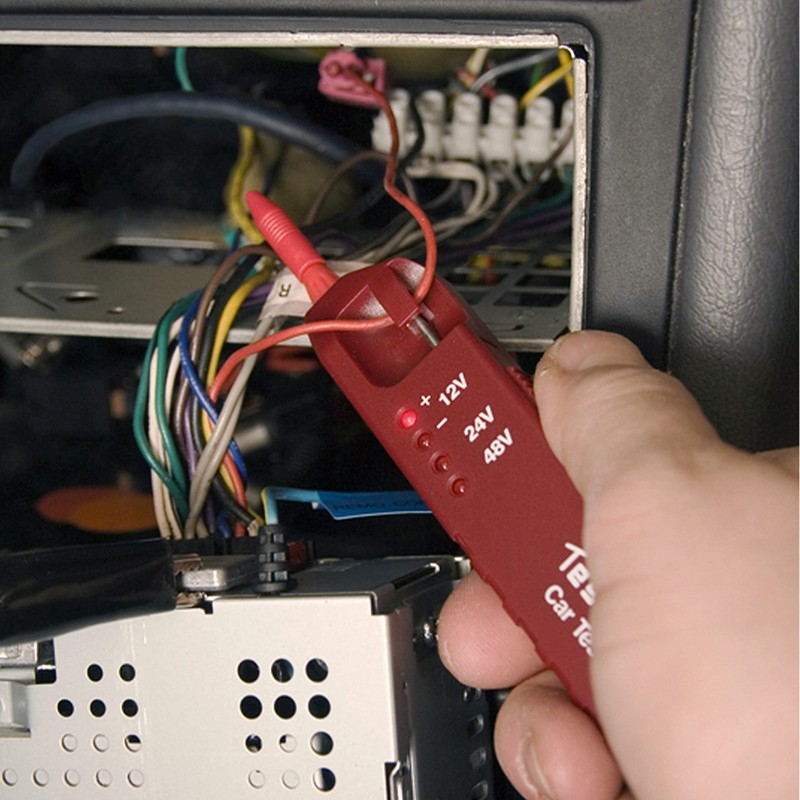 - Voltage tester ideal for locating faults in cars and lorries. Measures AC and DC from 3 V - 48 V, with integrated insertion unit for cables that are difficult to reach and polarity display.