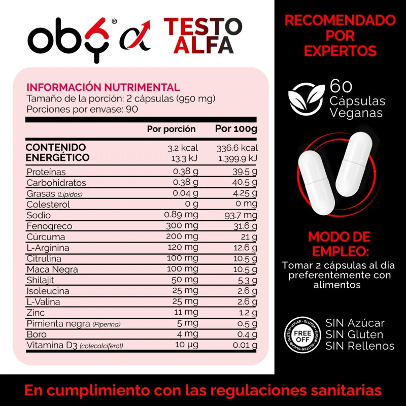 OBY TESTO ALFA | Multivitamínico para Hombre con 12 Ingredientes Premium Fórmula avanzada diseñada para el hombre alfa, con una potente combinación de 12 ingredientes clave de última generación: Fenogreco, Cúrcuma, L-Arginina, Citrulina, Maca Negra, Shilajit, Isoleucina, L-Valina, Zinc, Piperina, Boro y Vitamina D3. Ideal para mejorar tu rendimiento físico, vitalidad diaria y bienestar general. - ALTA POTENCIA: 12 ingredientes clave de última generación. - 100% VEGANO: Sin gluten, lactosa, azúcares ni colorantes artificiales. - PORCIÓN de 950mg por cápsula. - DOSIS SUGERIDA: 2 cápsulas al día con tus alimentos. 60 cápsulas. - SÉGURIDAD: Sello hermético y tapa de seguridad para mantener la frescura. Beneficios clave: 1. Fenogreco: Mejora la fuerza y equilibra los niveles hormonales. Maca Negra: Aumenta la vitalidad y el rendimiento físico. Shilajit: Apoya la recuperación muscular y la salud celular. L Arginina & Citrulina: Mejoran la circulación y reducen la fatiga. Cúrcuma: Propiedades antioxidantes y antiinflamatorias.
