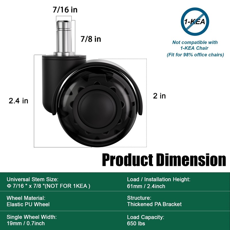 - 【Universal Size Stem】Computer gaming chair wheels designed for universal standard stem size: Φ 7/16 " x 7/8 " (Φ11 x 22 mm), fit with most of office chairs and gaming chairs, EXCEPT FOR 1-KEA chairs and other special brands. Before purchasing, please confirm whether the installation size is consistent with your old casters.
